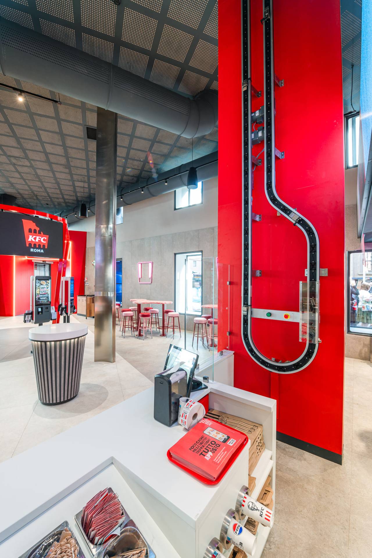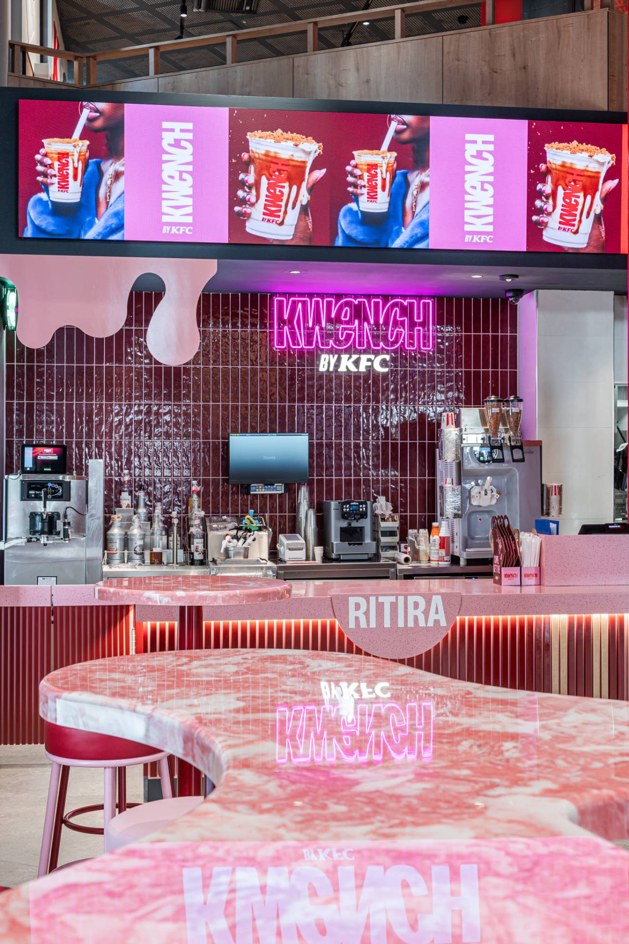 Ergänzt wird Beat durch die Kollektion Mold in der Farbe Iron, die für die Wände des Ausgabebereichs sowie für das große kontrastierende Kreiselement verwendet wurde, das den Boden des dreidimensionalen „Bucket“ prägt und den Bestellbereich definiert.