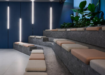 Ein dynamischer Raum, bestehend aus Kammern, die miteinander in Dialog treten und durch den roten Faden des Besucherauges verbunden sind, das diese Umgebungen visuell durchqueren kann, indem es direkte oder schräge Trajektorien errät.